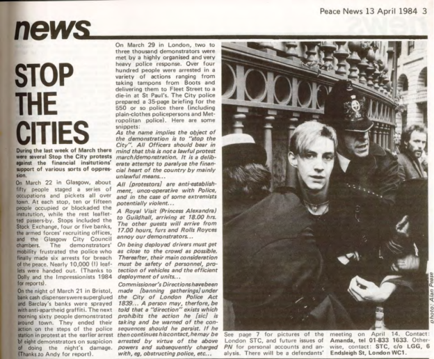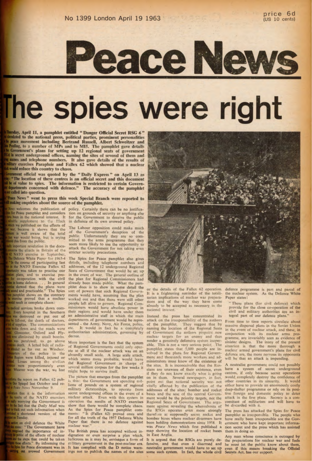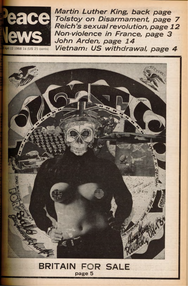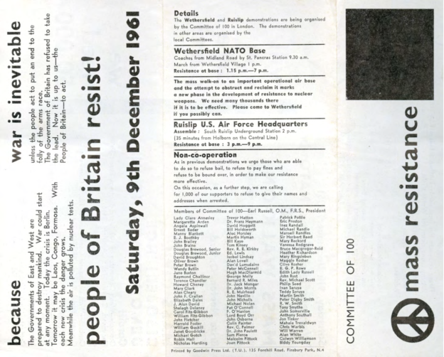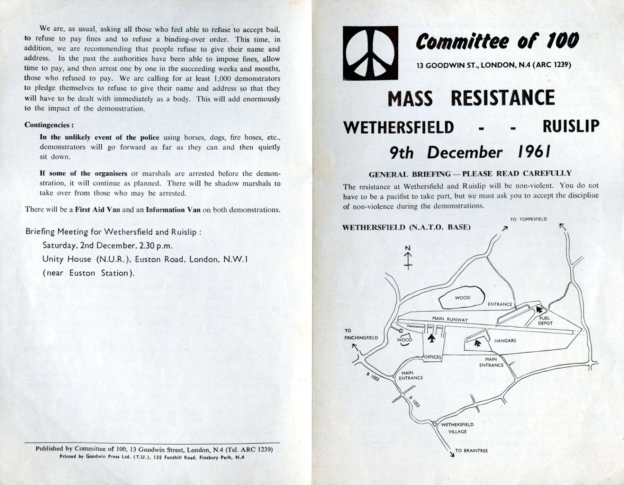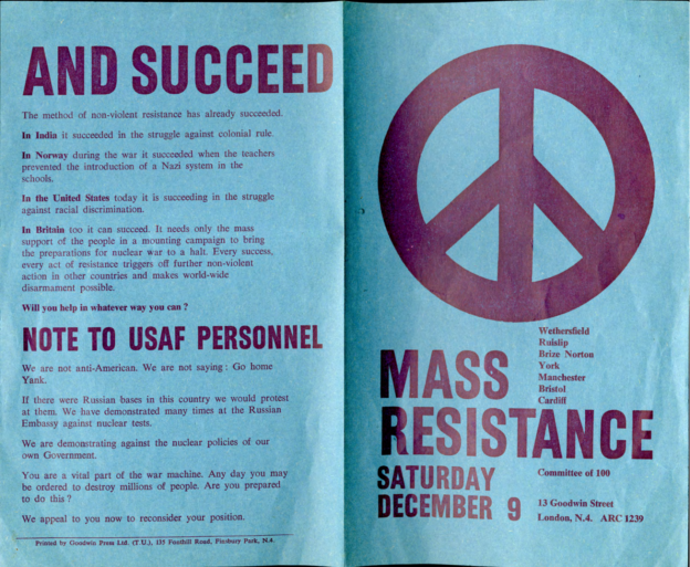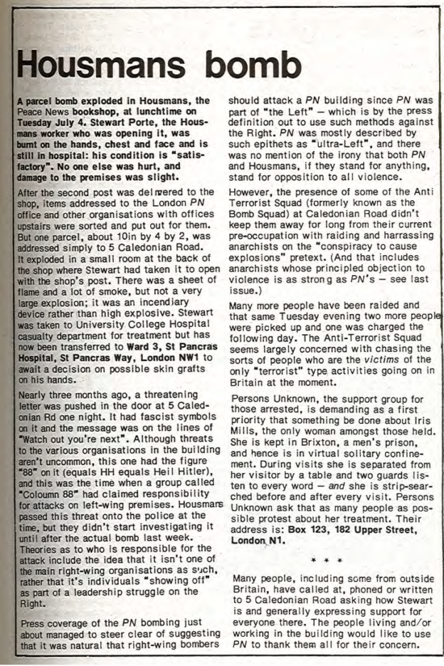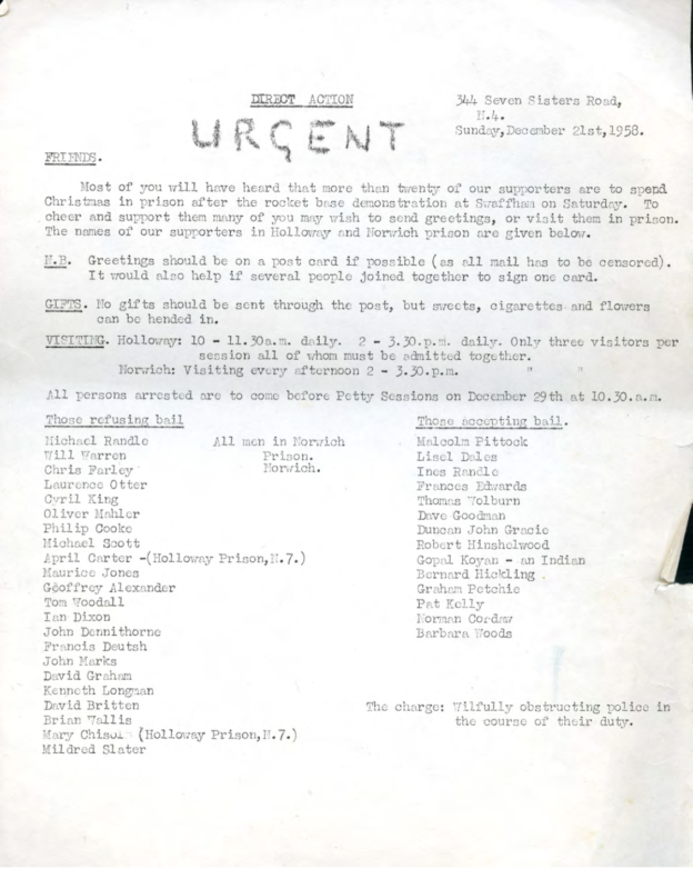 And then I think it was Pat said, ‘Well, why don’t we go to Housmans, you know, to Peace News?’ Oh. Off we went to Housmans, who of course were delighted to see us all. And we went up the back stairs, the, the entrance that’s, not the front door of the shop but another entrance. And we walked all the way up to the top, the very top floor. I think it’s a, a three-storey building isn’t it? But anyhow, the very top. And there was a big room there that was sort of, fairly empty. And we thought, right, what are going to do now? But she still hadn’t been arrested. So we thought, I know what we’ll do. We’ll ring the Daily Telegraph. So we rang the Daily Telegraph, and said there’s a fugitive at Housmans Bookshop, 5 Caledonian Road. And so, eventually, up turns the Daily Telegraph, and had a talk to us, and, took photographs, and there was a, there was a photograph of us all on Sunday’s, on the front page of Sunday’s Telegraph that week. And, in no time the police turned up. I think the Telegraph must have rung, rung them. And, so they… So there was various officers, about, five or six officers turned up. And… So we started sort of, chanting and making speeches. And they tried, obviously they tried to get Pat, who sat on the floor, or lay on the floor, and what we did was, to hold on to her, hold on to a leg, hold on to an arm. Just held on to her, several of us. And so, so the police were sort of, dragging us off her. And the moment that they dragged one of us off, another person stepped up and got hold of her. And so we had this tussle for quite a, quite a long time. I mean we knew we weren’t going to win; we were making a point, we were making a demonstration. And, so, eventually, they managed to get her. Of course, she wouldn’t, she refused to walk down, so they had to, had to carry her down all flights, three flights of stairs, which was quite [laughs] amusing. And, so, we went out into the street, and I said, and other people said, you know, ‘Right, now, disperse instantly.’ So we did. Because obviously that’s the point when the police then start coming to make trouble and trying to arrest, arrest the demonstrators.
