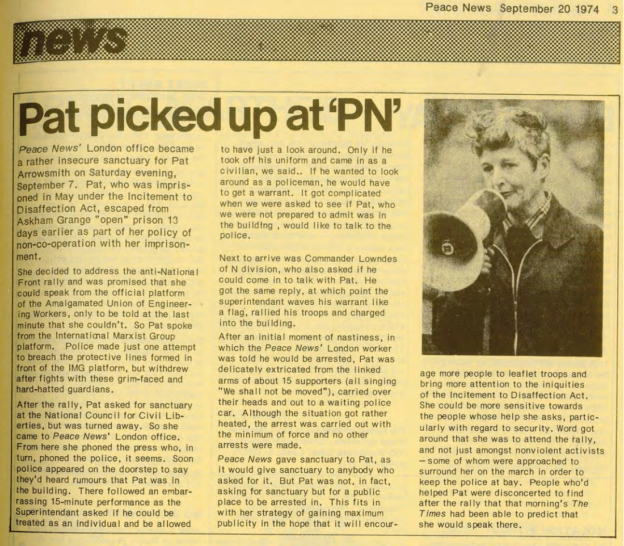 Shall I talk to you about Pat Arrowsmith? She had been a peace activist pretty well all her life. One of the things she did was, in her peace activism, was to break something called the Incitement to Disaffection Act. The Incitement to Disaffection Act means you will not, must not incite people in the armed forces to leave the armed forces. And, so, what Pat Arrowsmith did was to hand out leaflets to soldiers who were going to go to Northern Ireland, which is something she felt particularly strongly about, explaining how they could get out of the Army. One of the ways you could get out of the Army was to say you were gay. And anyhow, as it was against the law to incite disaffection, they promptly arrested Pat, sent her to Holloway, Holloway Prison in Pentonville Road in north London. And, rather to her surprise, after a few weeks they sent her to an open prison. Now of course she walked out. Well I mean, of course she would. And, then it came to the Saturday, and there was a big anti-fascist demonstration in Hyde Park, and, there was quite a, a lot of lesbian and gay people at it.